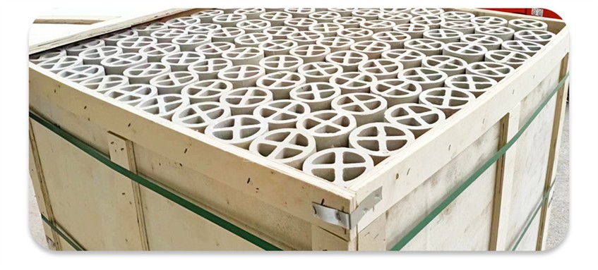 陶瓷一字環(huán)是基于增加填料的比表面以強化傳質(zhì)效率的想法之上而開發(fā)出來的,其結(jié)構(gòu)是在拉西環(huán)中增設(shè)了一字隔板。一般來講,陶瓷一字環(huán)填料由于尺寸較大,僅適用于整齊堆砌,目前一般只作為亂堆填料的塔底支撐分布層用。Φ80-200mm規(guī)格的十字隔板環(huán)可作支承材料,空隙率大于60%,個數(shù)為整聚數(shù)。
